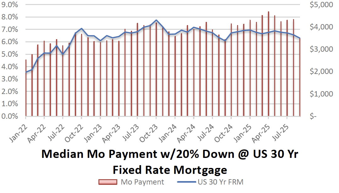 The Median Monthly Payment (w/ 20% down @ average FRM) for Sept 2025 dropped to the lowest level we've seen in 1 year. This was due to a large reduction in Bend's median sales price, accompanied by a .3% drop in rate.