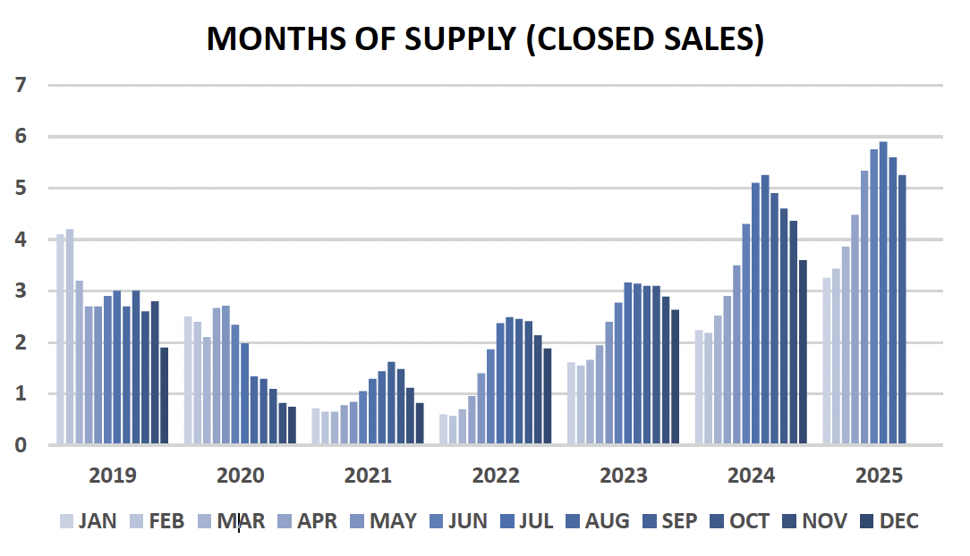 New listings by month came in flat to last year, a continued welcome change for sellers compared to the first half of 2025, where new listing volumes were growing at 10+ percent year over year. Supply still remains near a 10-year high, which may present challenges for those listing in the next few months.